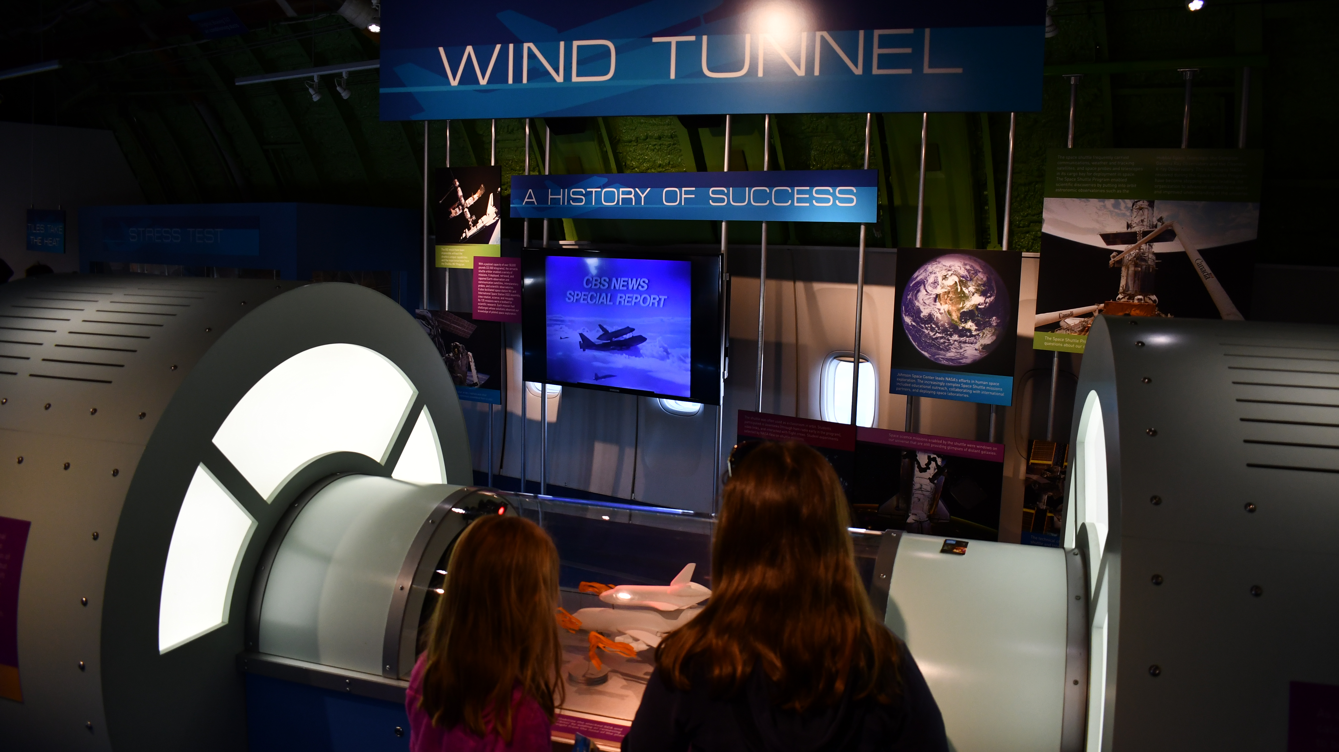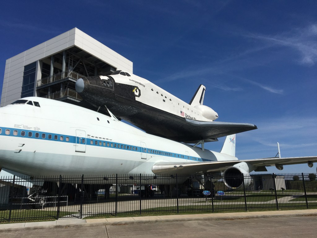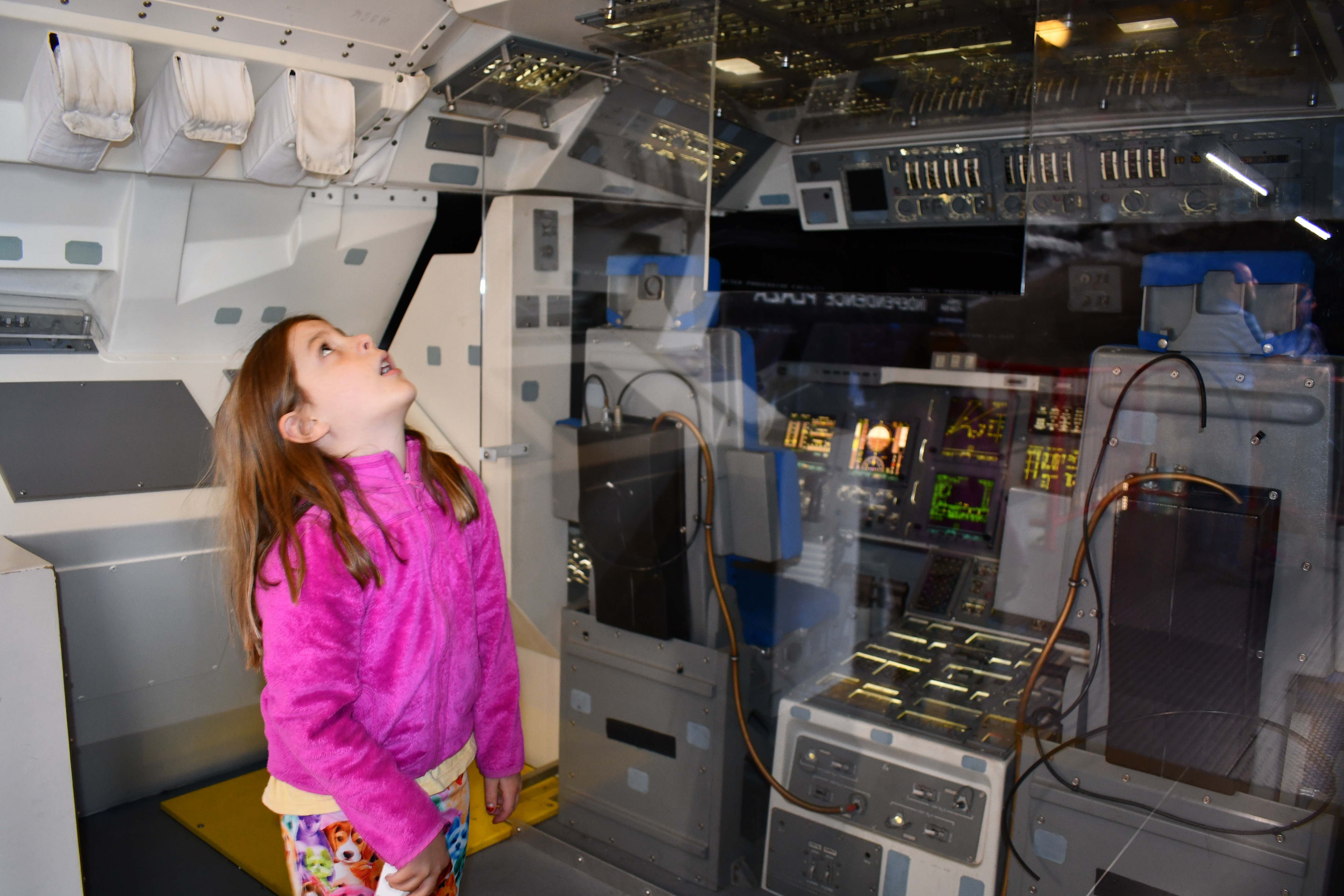 Independence Plaza houses the NASA 905, one of the two actual 747 shuttle carrier aircrafts; this one carried space shuttles 223 times. The inside gives you a glimpse into the interior adjustments needed to use it as a shuttle carrier; information lines both sides of the fuselage as well as displays down the center; the girls also had fun playing with a wind tunnel mock-up, trying to balance an airplane model to allow it to fly in different wind conditions. The space shuttle Independence that is on top of the carrier, is a mock up that is nevertheless impressive to tour.