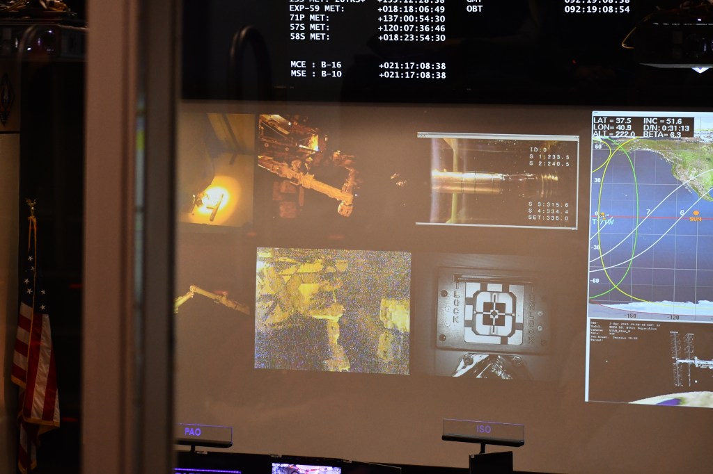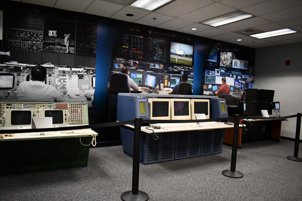 With the International Space Station (ISS) under 24-hour monitoring, part of the tour through Mission Control is a view of a control room, as well as a live feed of monitored information. (Also, because they are actively monitoring the ISS, the tour guides warned that any disruption of the workflow would result in the building being locked down and all tours canceled for the rest of the day.)
